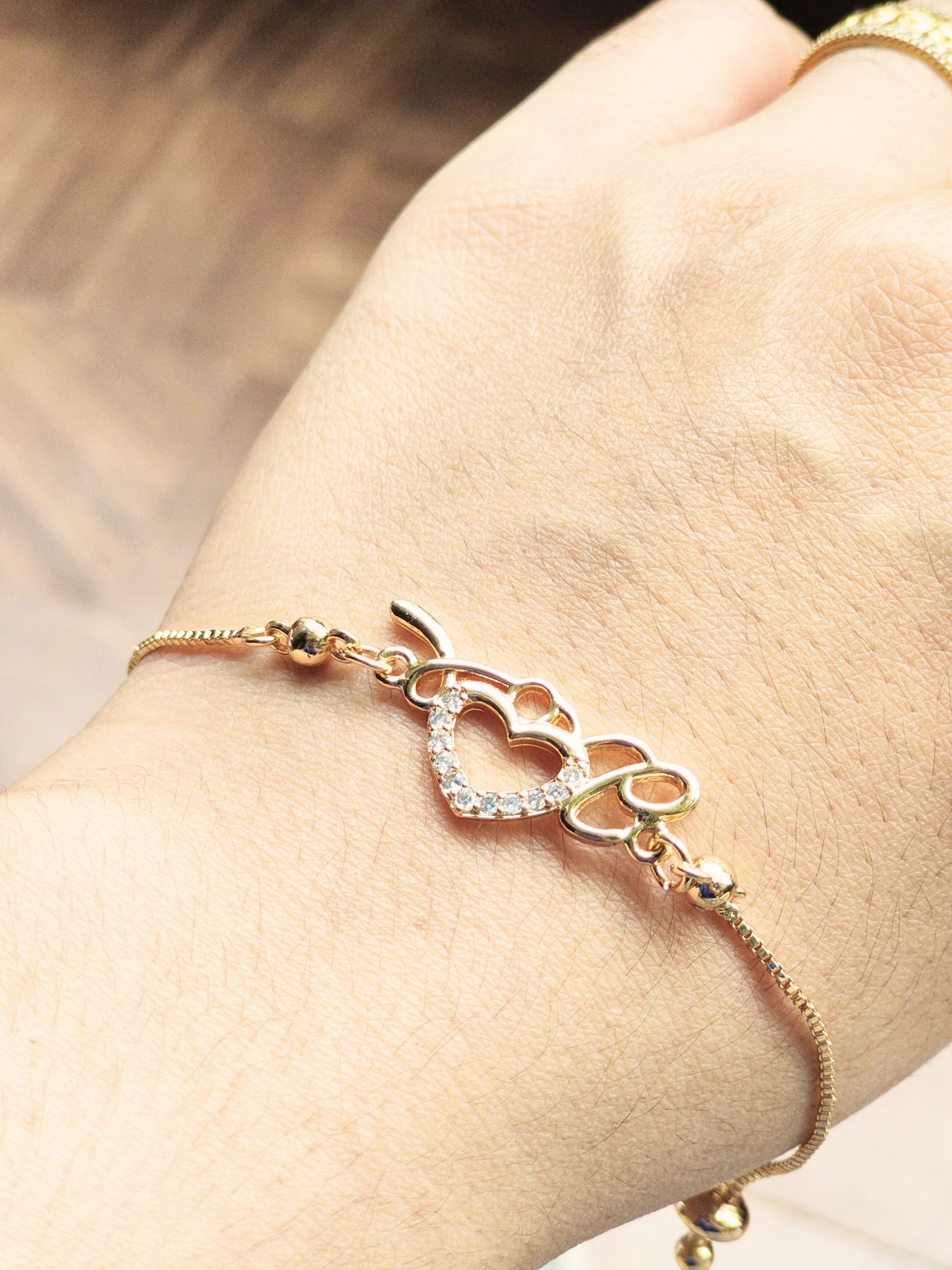 A symbol of affection that speaks louder than words — the Eternal Love Bracelet features a delicate heart encrusted with sparkling stones, wrapped in a golden infinity swirl that spells love in the most graceful way. Adjustable, elegant, and radiant, this bracelet is perfect for everyday charm or meaningful gifting.